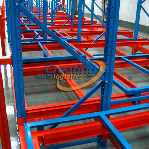 后推式货架利用的是小车作业,产品能够利用货架的坡度和自身的重量进行存取,而且能够实现货物的先进先出存储,对于那些有时间性要求的存储来说是非常有利的。